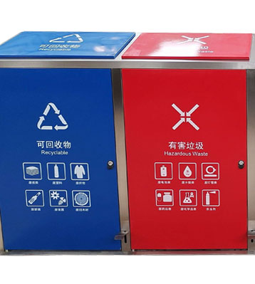 小區垃圾分類站點四類垃圾分類垃圾桶,不銹鋼無疑是較為理想的材質。它戶外防銹蝕效果好,表面金屬光澤高檔美觀,污漬也易清理。不銹鋼分類桶產品款式造型易定制,不受尺寸大小限制,滿足個性化需求,擺放于惠