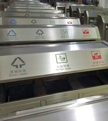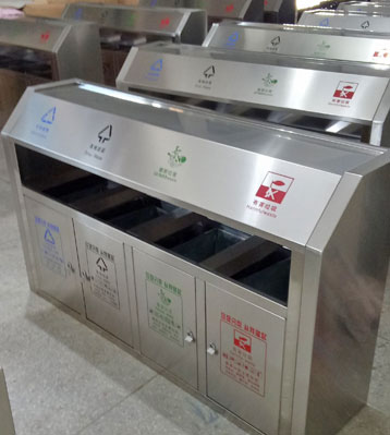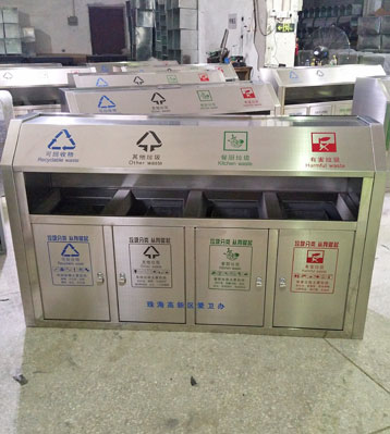 欣方圳斜切面不銹鋼四分類垃圾桶絲印新標準分類圖標